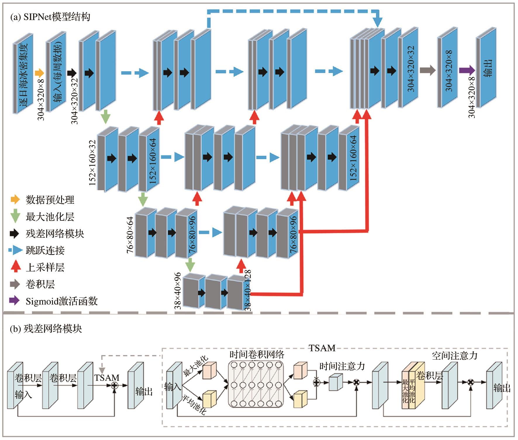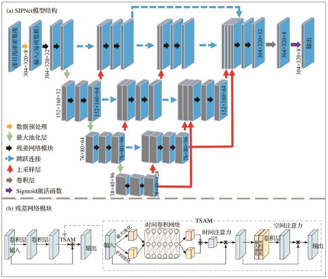 (a)包括输入、编码器、解码器和输出的模型结构,编码器模块包括残差网络模块和最大池化层,解码器由残差网络模块、上采样和串联层组成;(b)ResNet TSAM 块的结构(据参考文献[41]修改)。