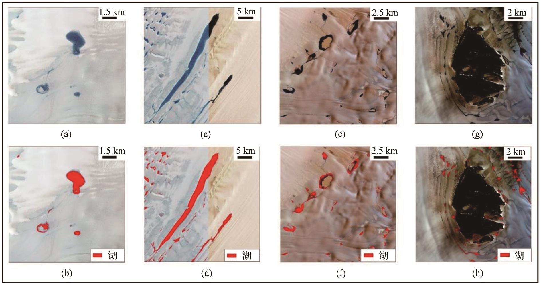 针对冻土和冰下水文系统状态,Shang等52利用RF分类算法和C波段先进散射计(Advanced Scatterometer,ASCAT)数据,结合美国国家航空航天局冰桥计划(Operation IceBridge,OIB)的测量数据,探讨了地表融水对格陵兰冰盖质量损失的影响,指出大量融水并未直接排出或重新冻结,而是以含水层形式储存在冰盖内部。针对冰盖日地表融化量定量估算,Zheng等53提出了一种区别于传统区域气候模式的BPNN模型策略,对融化通量进行训练构建,融水通量则基于现场大气和积雪观测以及地表能量平衡模型计算得出。定量估算显示,融化通量存在局部差异,有必要区分来自辐射计的活跃融体和剩余融水,并改进区域气候模式对消融过程的参数化方法。在高海拔地区进行更多的原位观测,预计将提高融体通量检索模型的可靠性。因此,监测冻土和冰盖含水层的变化应成为评估冰盖稳定性及其物质平衡的重要一环。在冰盖/冰架表面湖领域,针对冰上湖的分布和变化,Hu等54基于GEE(Google Earth Engine)平台,开发了一种结合纹理和形态特征的RF算法,用于格陵兰表面湖的自动识别。他们通过分析Sentinel-2卫星图像,计算了2016—2018年格陵兰岛融化季表面湖的融化量,并研究了其时空变化特征。目前,南极表面水体的快速自动提取和量化主要依赖遥感卫星影像和归一化水体指数(Normalized Difference Water Index,NDWI)。然而,NDWI方法通常将雪泥、岩石、蓝冰和阴影等非水体特征误判为水体,降低了量化的准确度。针对深度学习在南极表面水体识别中的应用所面临的高质量标签数据集匮乏和适用模型选择困难等问题,Niu等35选择卷积神经网络U-Net模型,并基于Sentinel-2多光谱卫星图像特点添加了带有注意力机制的模块,在使用NDWI及其人工修正基础上,建立了可信度较高的南极表面水体标签数据集,显著提升了表面水体自动提取的效果。在Amery冰架不同位置的水体提取试验表明,该模型既能对地形较为平坦区域的水体(图像背景干扰因素较少)进行提取,也能对细小密集的湖泊群(背景干扰相对较大)进行识别。U-Net对存在色差的拼接影像或表面起伏较大而空间分布又较为分散的影像也能较好地提取水体(图2)。图2展示了利用U-Net模型对Sentinel-2图像的水体提取结果,其中图2(a)、图2(c)、图2(e)和图2(g)为原始影像,分别展示了不同区域的地表信息,以及可见拼接区域的色差和起伏较大的表面特征;而图2(b)、图2(d)、图2(f)和图2(h)为U-Net自动提取的水体结果,表现出明显优于传统方法的水体区分效果。同时,相对于其他基于阈值法的水体提取方法,U-Net对岩石和水体的区分更为准确。针对格陵兰冰盖表面湖的轮廓提取,彭博洋等55使用U-Net模型对Landsat卫星影像中的冰面湖进行了提取试验。