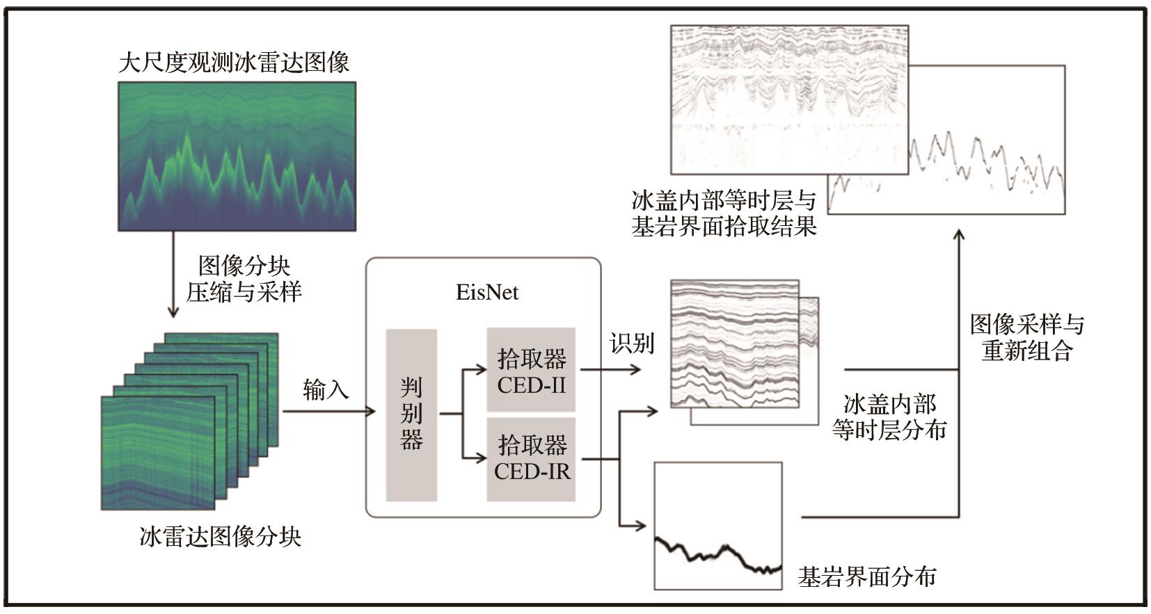 深度学习提供了一种突破传统物理方法局限的潜在技术途径。EisNet模型利用合成数据训练卷积神经网络,成功实现了基岩界面与内部等时层的自动识别,有效抑制了干扰1575图4展示了EisNet模型在雷达图像中拾取这些层位的工作流程,具体包括冰雷达数据预处理、卷积神经网络特征分类(其中,CED-II模块用于提取仅包含冰层的雷达图像,而CED-IR模块则用于同时提取冰层和基岩界面的特征)以及模型训练实现层位提取。相比传统方法需要依赖明显的信号对比度和人工选点,深度学习方法能够通过端到端的数据驱动学习,捕捉低振幅、深层噪声、非线性叠加结构以及复杂内部纹理特征,从而识别在物理上不可解的层位。与传统方法相比,深度学习能够在低振幅、强噪声及深层非线性结构环境中学习复杂模式,实现传统算法无法解析的层位提取,特别是在信号被噪声淹没、层界不连续或局部消失的区域,AI方法可以基于上下文和全局特征进行智能预测与补全,从根本上突破物理模型无法求解的局限,这解决了手工或物理建模难以覆盖的“不可解”深层问题。但其在快速冰流区、冰架、冰下水复结冰或强环境杂波导致的低质量图像中的识别能力仍有待提升。Peng等76结合傅里叶变换/小波重构的预处理与基于自注意力的ST-SOLOv2实例分割网络,初步实现了深霜层的自动提取。总体来看,AI方法通过学习数据驱动的复杂非线性特征,显著提升了冰盖内部结构提取的精度和效率,突破了传统物理方法在极端极地环境下对深层、低信噪比以及非线性结构区域无法识别的瓶颈。进一步地,AI技术为冰盖动力学过程的解析提供了新的视角,通过提取复杂的冰盖内部结构,能够揭示冰盖运动、热流传导和物质输送等动力学过程的关键特征,从而推动冰盖演化历史的定量研究。然而,现有方法在捕捉冰雷达数据深层非线性结构方面仍显不足,亟须开发鲁棒性、适应性更强的智能算法,以满足南极冰盖大范围、高精度内部冰层建模的迫切需求,为理解冰盖稳定性与演化历史提供坚实的数据支撑。