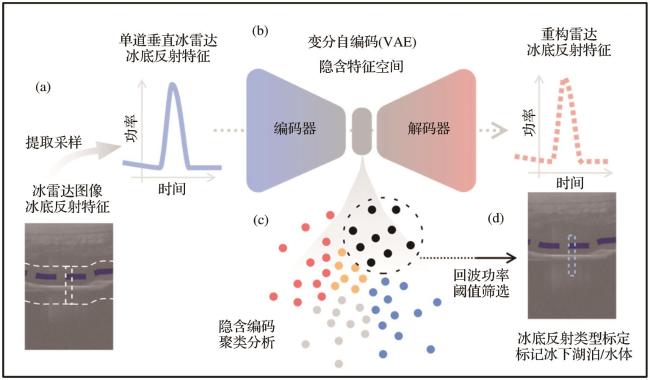 (a)单道冰底反射特征提取;(b)变分自动编码器(VAE);(c)冰底反射降维特征聚类;(d)冰下湖标记。