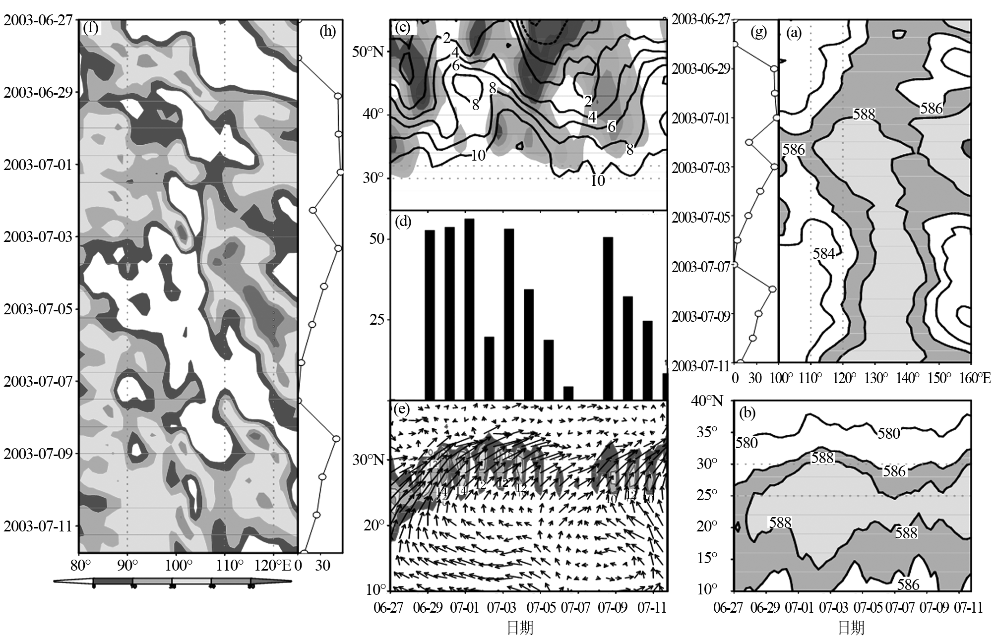 图3 2003年6月27日至7月11日淮河流域致洪暴雨的天气学模型 a和b分别为500 hPa位势高度单位:10 gpm27.5#cod#x000b0;~32.5#cod#x000b0;N平均经度时间剖面图和110#cod#x000b0;~130#cod#x000b0;E平均纬度时间剖面;c为110#cod#x000b0;~120#cod#x000b0;E平均的700 hPa温度和经向风纬度#cod#x02014;时间剖面,等值线间隔为2 ℃,实线表示温度#cod#x02265;0 ℃,虚线表示温度#cod#x02264;0 ℃,阴影:偏北风;d,g,h均为淮河流域32#cod#x000b0;~34#cod#x000b0;N,115#cod#x000b0;~120#cod#x000b0;E日均降水量单位:mm;e表示110#cod#x000b0;~120#cod#x000b0;E平均的季风涌随时间的演变,箭头表示整层地面到300 hPa的积分水汽通量单位:kgm#cod#x000b7;s;阴影表示风速#cod#x02265;12 m s;f为32#cod#x000b0;~34#cod#x000b0;N 600 hPa涡度#cod#x02265;0,单位:10 -5 s -1 的经度#cod#x02014;时间剖面 [ 50 ] Fig.3 The synoptic model for the floodingcausing heavy precipitation in Huai River during 2003.06.27-2013.07.11 aand b Denote longitudetime 27.5#cod#x000b0;~32.5#cod#x000b0;N and latitudetime 110#cod#x000b0;~130#cod#x000b0;E plot of geopotential height at 500 hPa unit: 10 gpm; cDisplays the latitudetime 110#cod#x000b0;~120#cod#x000b0;E plot of meridional wind and temperature at 700 hPa, with contour interval 2 ℃, the shadings indicates the northerlies; d,gand f Represent the daily precipitation unit:mm of Huai River 32#cod#x000b0;~34#cod#x000b0;N,115#cod#x000b0;~120#cod#x000b0;E; e Shows the evolution of the monsoon flux110#cod#x000b0;~120#cod#x000b0;E, with arrows indicating the verticallyintegrated water vapor flux from ground to 300 hPa unit: kgm#cod#x000b7;s,the shadings denote that the wind speed is greater than 12 ms; f Shows the longitudetime 32#cod#x000b0;~34#cod#x000b0;N plot of vorticity at 600 hPa, with shadings indicating positive vorticities unit: 10 -5 s -1 [ 50 ] |