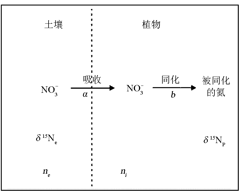 式中: a为植物吸收NO3-过程所发生的氮同位素分馏, b为植物同化NO3-并被转化成植物有机质产生的氮同位素分馏, ne为N源中NO3-浓度, ni为植物体内NO3-浓度, δ15Np、 δ15Ne分别为植物和N源的 δ15N。