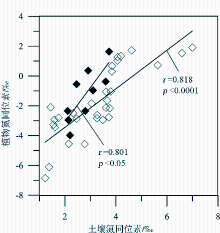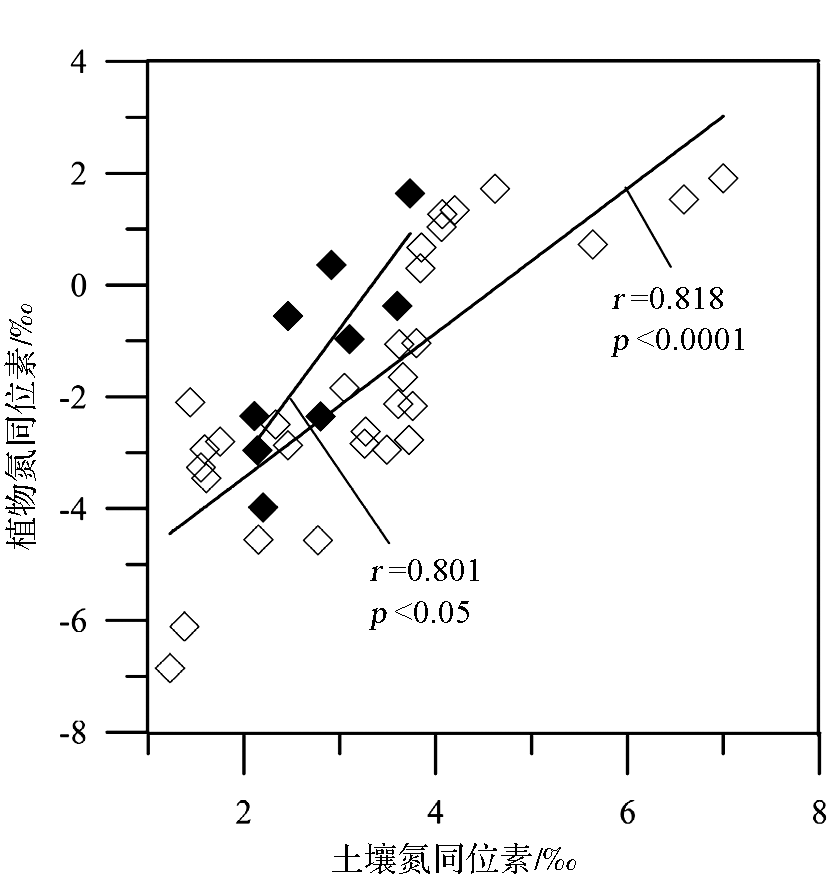 ![]() | 图2 贡嘎山东坡表层土壤氮同位素与植物氮同位素关系[ 32]Fig.2 Correlations of surface soil15N and leaf15N for C3and C4 plants occurring on the eastern slope of Mount Gongga[ 32] |