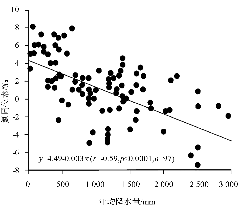 ![]() | 图4 植物氮同位素随降水的变化[ 14]Fig.4 Variation in plant15N values with the changes in mean annual precipitation[ 14] |