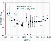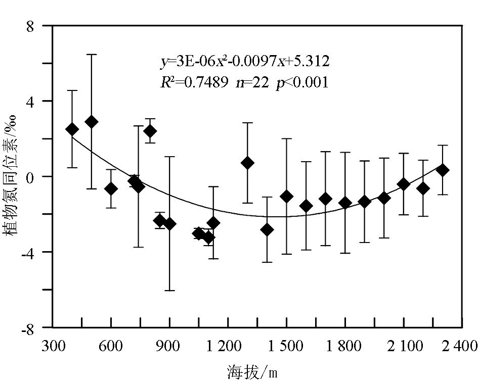关于植物 δ15N随海拔高度的变化,国内外已有较多的研究[ 12, 15, 55, 67]。尽管如此,但对于植物 δ15N随海拔高度变化规律的认识,学术界仍存在分歧。多数研究认为,不管是单个植物种还是整体植物,其 δ15N均具有随海拔高度增加而逐渐变轻的趋势。如Liu等[ 12]对东非大裂谷C3植物 δ15N随海拔变化的结果显示,海拔每增加100 m,植物平均 δ15N偏负0.2‰;Sah和Brumme[ 55]在尼泊尔的研究也表明,高海拔地区的植物 δ15N明显小于低海拔地区。但也有一些结果与之不同甚至相反,Bai等发现固氮植物叶片的 δ15N与海拔高度不相关[ 67],Vitousek等[ 51]在夏威夷火山国际公园也得到了类似的结果,而Yi等[ 43]在青藏高原3 250~4 300 m的海拔范围内,发现高寒草甸植物 δ15N随海拔升高有逐渐变重的趋势,但不显著。通过对北京东灵山地区植物氮同位素的系统调查[ 15],发现植物 δ15N平均值与海拔呈二次曲线关系(图6),海拔低于1 350 m时植物 δ15N与海拔高度呈负相关,高于此值时则表现为正相关。对于上述各种不同的结果,Mariotti等[ 20]把山区植物 δ15N随海拔高度增加而逐渐偏负的原因归结为随海拔上升所引起的降水增加和温度降低的影响,而Yi等[ 43]则认为植物 δ15N与海拔出现正相关的情形可能与海拔升高引起降水减少和蒸发量增大而导致的水分胁迫有关。Amundson等[ 16]在总结已发表的研究结果后,认为在局部地区植物 δ15N随海拔的变化也可能出现正相关或变化趋势不明显的情形,这主要是由于植物 δ15N组成不仅受局部微生境的影响,而且还受复杂的植物生理、土壤氮素转化等一系列生物地球化学过程的控制。