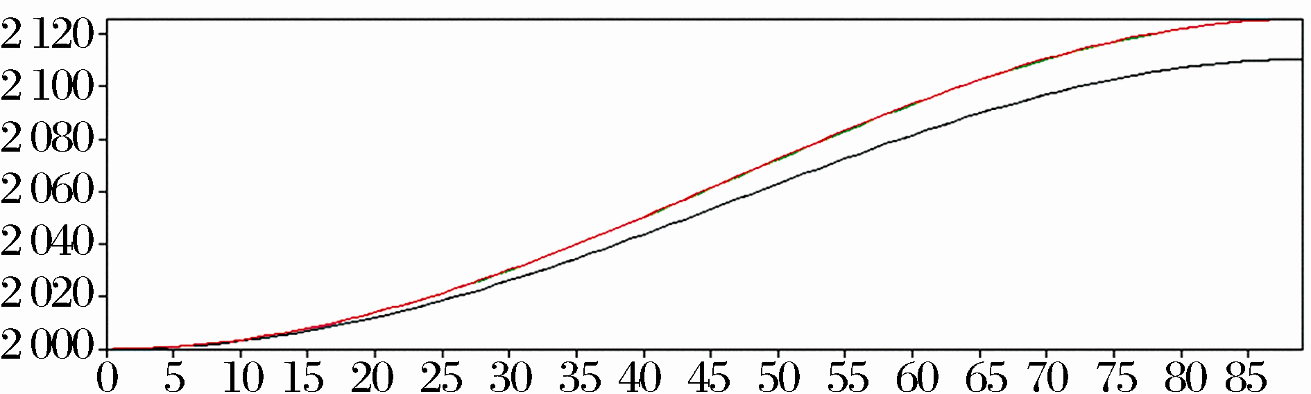 ε=0.065,δ=0.059时的VTI介质相速度曲线 黑线表示准确相速度曲线;红线表示 V