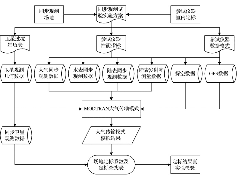 式中:DNi为卫星的通道i的计数值, Gi为卫星通道i的定标斜率, Ii为截距。要得到定标系数Gi和Ii, 必须有至少2组Leqi和DNi。目前, 我国在轨的风云系列气象卫星和海洋卫星[17, 18]都具有观测冷空间的能力, 因此, 通过观测地表辐射定标场和冷空就可以得到2组Leqi和DNi, 完成在轨场地绝对辐射定标。红外通道场地辐射定标流程如图1所示。