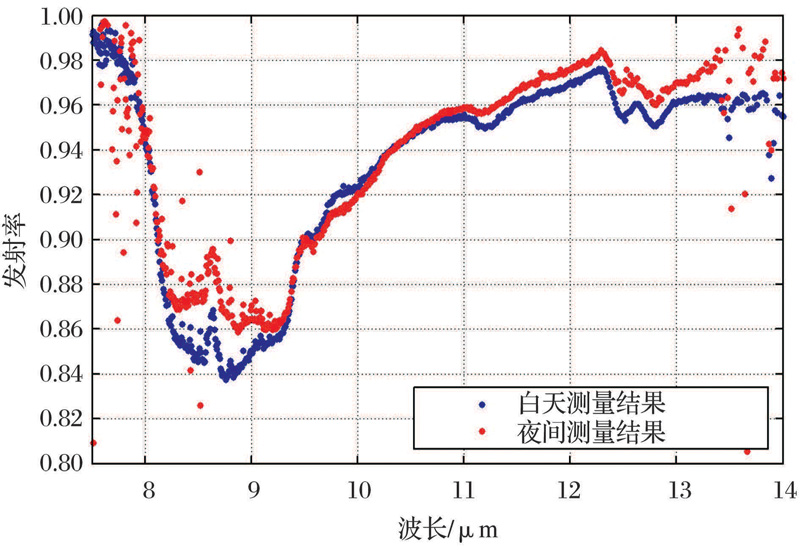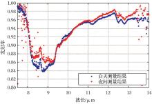 CRCS-TIR-FCM辐射定标方法的主要特点是综合利用中国遥感卫星辐射校正场青海湖场区和敦煌场区的地面同步观测数据, 来实现对在轨卫星红外通道的绝对辐射定标。目前, 国内外的红外卫星遥感器在轨场地绝对辐射定标主要是利用高海拔、大气干洁、人为扰动少、温度场分布均匀的高原湖泊作为定标靶区, 可以达到很好的定标精度; 但是, 这些目标区域往往水表温度较低, 且低于卫星对地观测的绝大部分目标, 只能满足辐射定标线性低端的精度要求。因此, 必须找到一个高温的陆面目标作为定标靶区进行在轨定标。要利用高辐亮度的陆表进行辐射定标, 则陆表发射率是必须考虑的关键因子之一。近年来, 张勇等[19]对敦煌戈壁的陆表发射率光谱进行了测量, 获取了高精度的地表发射率数据, 图2为敦煌陆表实测发射率光谱数据。CRCS-TIR-FCM方法在考虑敦煌戈壁表面发射率的基础上, 利用戈壁表面进行热红外通道的在轨绝对辐射定标, 极大地拓展了热红外通道场地辐射定标的动态范围, 使敦煌场区也可用于红外通道的场地绝对辐射定标。将青海湖场区和敦煌场区的地面同步观测数据同时应用于红外遥感器的绝对辐射定标, 将有效地提高在轨场地绝对辐射定标的精度。