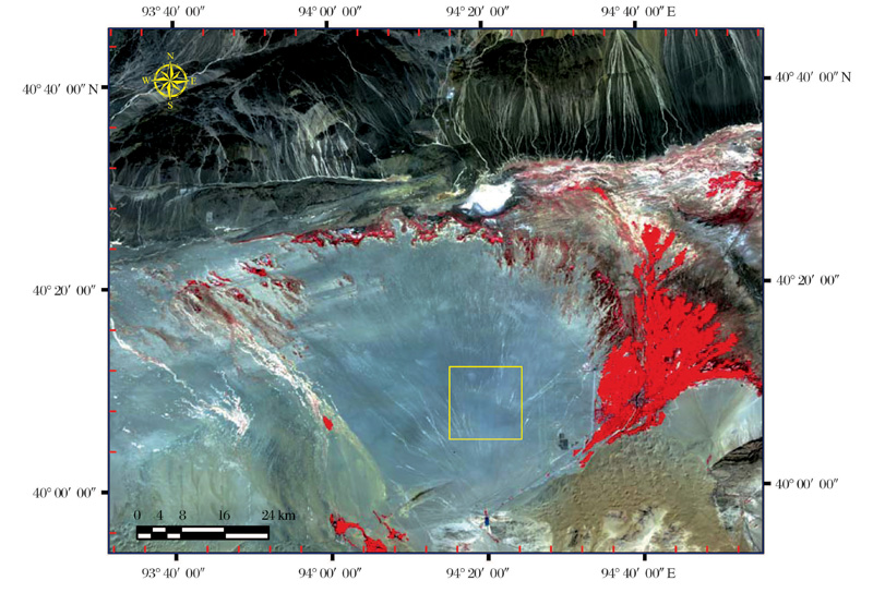 中国遥感卫星辐射校正场— — 敦煌戈壁[21], 位于我国甘肃省西端敦煌市以西15 km的戈壁滩上。辐射校正场座落在党河洪积扇中部, 党河洪积扇体呈银杏叶状, 由南向北展开, 整个扇体长约50 km, 宽60 km。扇体南高北低, 党河河口标高约为1 400 m, 至北部盐碱沼泽地带降为1 060 m, 扇体坡降约为340 m。场区位于扇体中部, 南部标高1 300 m左右, 北部标高1 140 m, 坡降为160 m。校正场区处于地球中纬度(35° ~45° N)干旱气候带内, 西部邻近我国最大沙漠区— — 塔克拉玛干沙漠, 其东延部分称库木塔格沙漠, 场区距此沙漠带仅数十公里。根据敦煌气象台提供资料, 本区年降雨量平均不足30 mm, 年蒸发量2 200~2 400 mm, 夏季炎热, 冬季寒冷多风。场区没有经常性地表经流, 植被稀少, 地面主体为裸露平坦的碎石组成的戈壁滩。场区地理位置及地形地物特点为光谱测量创造一个时空变化幅度较小的场所, 这有利于场地的建设和长年使用。敦煌同步观测区选择为辐射校正场中心区(图4)。测量区域中心海拔为1 085 m, 经纬度分别为40° 8'15.00″N, 94° 19'15.00″E。该场区主要用于可见/近红外通道的场地绝对辐射定标, 近年来拓展到红外波段的场地定标。