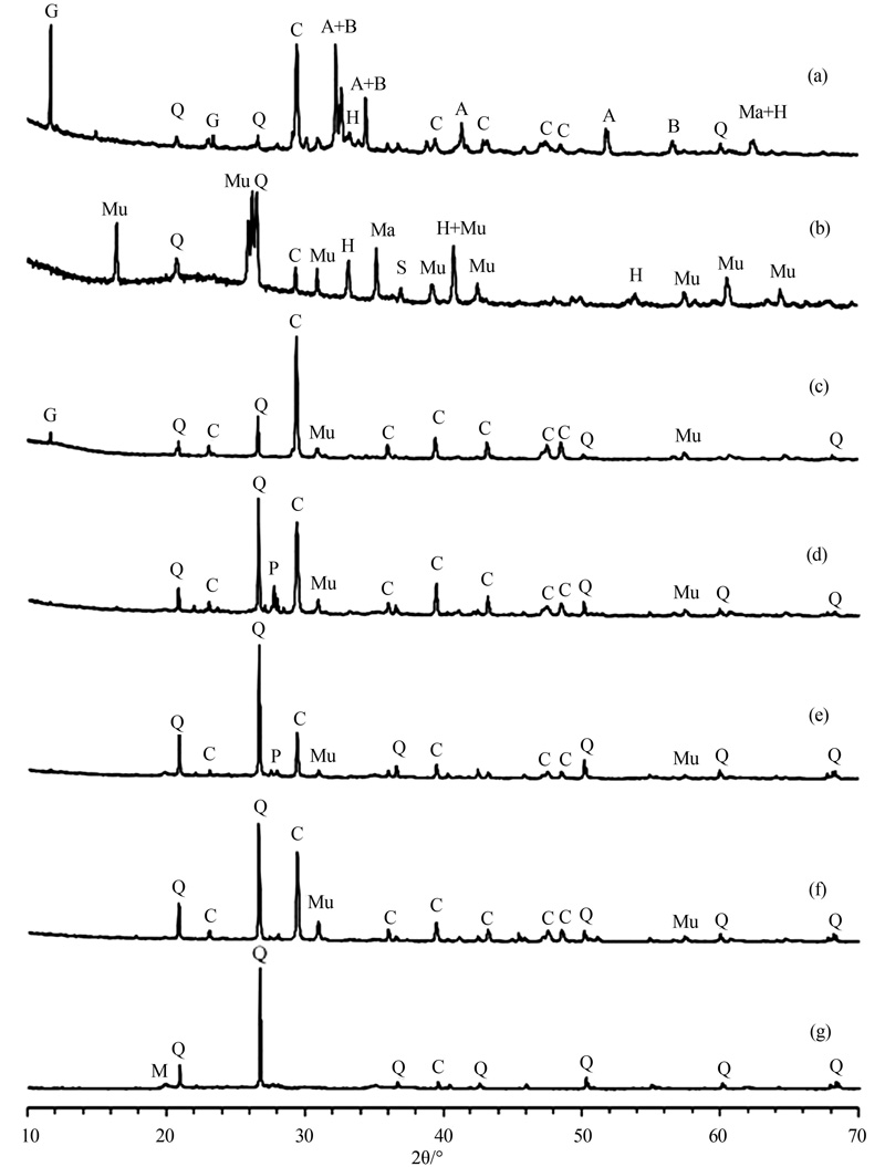 X-ray patterns and SEM/EDX photos of representative samples of cement dust, cement factory dustfall, cement, coal ash, topsoil of green space in the factory and topsoil outside the factory were shown in fig.2 and fig.3. According to the combination of minerals, all samples can be divided into 3 categories: The first category was the cement samples, and its main mineral compositions were tricalcium silicate, dicalcium silicate, calcite, quartz, gypsum, and a few magnetite and hematite; The second category was the coal ash sample, and its main mineral compositions were mullite, quartz, magnetite, hematite, and a few sillimanite and calcite; The third category was the samples of cement dust, cement factory dustfall, topsoil of green space in the factory and topsoil outside the factory, and their main mineral compositions were quartz, calcite, and a few mullite. In addition, topsoil of green space in the factory had a few gypsum, and cement dust and topsoil outside the factory had a few plagioclase. The XRD pattern of cement factory dustfall, topsoil of green space in the factory and topsoil outside the factory was same as cement dust (Fig.2c~f), which would suggest that these three kinds of samples had been polluted by cement dust. The XRD pattern of soil sample of 68 cm under the ground showed that the main mineral composition was quartz (Fig.2g) with very few calcite, but the calcite content was high in topsoil samples possibly polluted by cement dust. The SEM/EDX photos showed that coal ash particles were spherical with smooth surface, and the content of Si, Al and Fe elements was relatively high (Fig.3b). Other sample particles were massive with many small particles adsorbed on the surface of large particles. The content of Ca, Al in topsoil of green space in the factory and topsoil outside the factory was high; however, the soil sample of 68 cm under the ground was low.