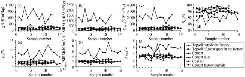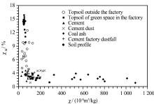 Previous studies results indicate that the magnetic properties of samples werecontrolled by magnetite, therefore the χ -χ fd scatter plots can be used to analyze relationship between the magnetic mineral concentration and grain size. The distribution of all kinds of samples had significant differences in the χ -χ fd scatter plots (Fig.10). The samples of cement dust, cement factory dustfall, cement, coal ash and topsoil of green space in the factory were mostly distributed near the horizontal axis (χ axis) position with high χ values and less than 3% χ fd average values (Fig.10, Table 1). It showed that the grain size of magnetite was coarser. Dearing analysis plots (Fig.9) showed that the magnetic minerals in these 5 kinds of samples were mainly MD and PSD particles, which was the typical magnetic characteristics of industrial dust and soil polluted by industrial dust[6, 25~29]. The samples of soil profile below 10 cm were mostly distributed near the longitudinal axis (χ fd axis) position. Compared with above 5 kinds of samples, their χ values were low for higher χ fd average values of 14.3%, which showed the typical magnetic characteristic of natural soil. However, topsoil outside the factory and 0~10 cm soil on the profile may be polluted by cement dust, because the magnetic properties of these samples were mainly distributed between those of soil profile below 10 cm and cement dust, cement factory dustfall, cement, coal ash and topsoil of green space in the factory in the χ -χ fd scatter plots (Fig.10). The magnetic parameters (χ and SIRM) which express the concentration of magnetic mineral in soil show fewer changes than magnetic parameters (χ fd, χ ARM/χ and χ ARM/SIRM) which express the grain size (Fig.10, Table 1). Therefore, the magnetic parameters (χ fd, χ ARM/χ , χ ARM/SIRM) values can reflect the soil pollution level, i.e., the lower χ fd, χ ARM/χ and χ ARM/SIRM value was, the more serious soil was polluted. The measurement results showed that the magnetic parameters (χ fd, χ ARM/χ and χ ARM/SIRM) average values of the 0~10 cm soil on the profile, topsoil outside the factory and topsoil of green space in the factory decreased in turn (Table 1), which may indicate that the pollution levels of the 3 kinds of soil increased orderly.