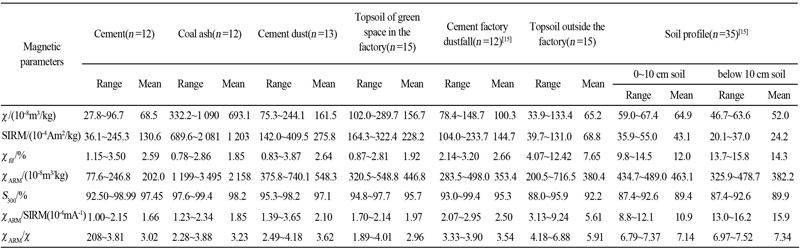 The χ -SIRM scatter plot is helpful to investigate the magnetic mineral compositions in the samples[22]. The analysis results showed that χ and SIRM of cement dust, cement factory dustfall, cement, coal ash, topsoil of green space in the factory and topsoil outside the factory had significant positive correlation (R2=0.9399) (Fig.7), which indicated that the magnetic properties of all samples were dominated by a type of magnetic mineral. Combined with the XRD patterns of representative samples (Fig.2) and measuring results of S300, Bcr and κ -T curves, we can confirm that the major magnetic mineral in samples was low coercivity magnetite that dominated the magnetic properties of samples.