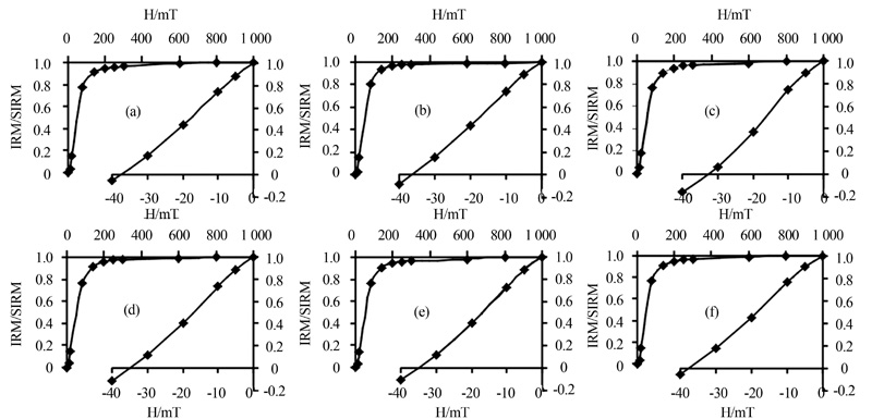 The S300 average value of all samples was larger than 90% (Fig.4d, Table 1). IRM acquisition curves and anti-field demagnetization curves showed that the IRM increases rapidly and reach 95% SIRM below the magnetic field of 300 mT (Fig.5), and the maximum Bcr value of all samples was 37.5 mT (cement factory dustfall). These results indicated that the magnetic properties of 6 kinds of samples were dominated by low coercivity ferromagnetic minerals.
