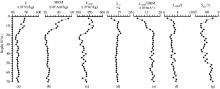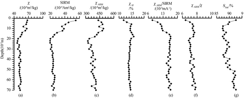 Magnetic parameters can reflect composition, concentration and grain size of magnetic minerals[16]. χ and SIRM were mainly correlated with composition and concentration of magnetic mineral in sample. χ fd can reveal magnetic mineral concentration of Super-Paramagnetic (SP) particles. χ ARM can reflect ferromagnetic mineral concentration of fine Single-Domain (SD) particles[17]. χ ARM/χ , χ ARM/SIRM can reflect the relative change of magnetic mineral grain size[18]. S300 and Bcr indicated the relative proportion of antiferromagnetic minerals and ferromagnetic minerals.