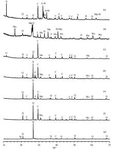 The κ -T curve was used to detect magnetic mineral compositions in samples[19, 20]. The κ -T curves were measured by 6 kinds of representative samples (Fig.6), and the results showed that all κ -T curves can be divided into 3 types. The first type was topsoil outside the factory (Fig.6a): The magnetic susceptibility value of cooling curve was far higher than that of the heat-ing curve, which suggested a large number of strong magnetic minerals were produced during the heating process[21]. The second type was coal ash (Fig.6d): The cooling curve was very close to the heating curve, which indicated that the magnetic minerals in sample had not changed in the heating process, because the mineral compositions of coal ash had good thermal stability after high temperature combusting. The third type was cement, topsoil of green space in the factory, cement dust and cement factory dustfall (Fig.6b, c, e, f): The cooling curves were higher than the heating curves, and the κ -T curves shape were basically same, which indicated that a few new strong magnetic minerals were produced during the heating process. The magnetic susceptibility of all samples dropped sharply and reached zero when they were heated to 585 ℃ of the curie temperature of magnetite. The cooling curves of all samples were similar with that of the magnetite. The κ -T curve experiments indicated that the major magnetic mineral in samples was magnetite, and the magnetic susceptibility was dominated by the concentration of the magnetite.