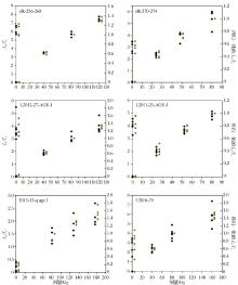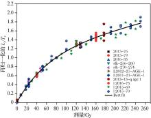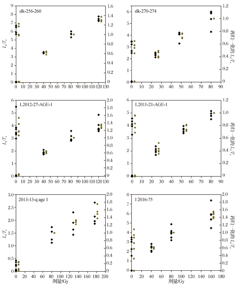 图2中的6个小图分别展示了6个样品的Lx/Tx信号和再归一化后的Lx/Tx信号对此图, 其中每个样品对应4~7个测片。横坐标表示每个测片对应的再生剂量, 通过仪器RisØ DA-15 OSL/TL reader的测量, 可得到每个测片自然剂量和各个再生剂量处的Lx/Tx信号, 即在图2中左边纵坐标所对应的菱形散点。而将每个测片各个剂量处的Lx/Tx信号对各自80 Gy处的Lx/Tx信号进行“ 再归一化” (见公式(7)), 得到“ 再归一化” 后的Lx/Tx信号, 即在图2中右边纵坐标所对应的浅色圆形散点。比如样品L2012-27-AGE-1其中一个测片在0, 40, 80和120 Gy处的Lx/Tx信号分别为0.026, 1.911, 2.872和3.753, 对80 Gy处的Lx/Tx信号再归一化后为:0.009053, 0.66539, 1, 1.306755, 发现再归一化后的Lx/Tx信号更加收敛。由图2可知, 每个样品80 Gy处的再归一化的Lx/Tx均为1, 低于80 Gy则小于1, 高于80 Gy大于1。无论Lx/Tx信号还是再归一化的Lx/Tx信号均呈指数增长, 但是再归一化之前的散点离散度较大, 再归一化后的散点更加收敛, 表明再归一化后多个样品共同拟合的生长曲线更加收敛, 趋于一致。其中再生剂量为0 Gy处的点(零点附近除外)的信号指的是样品的自然信号。