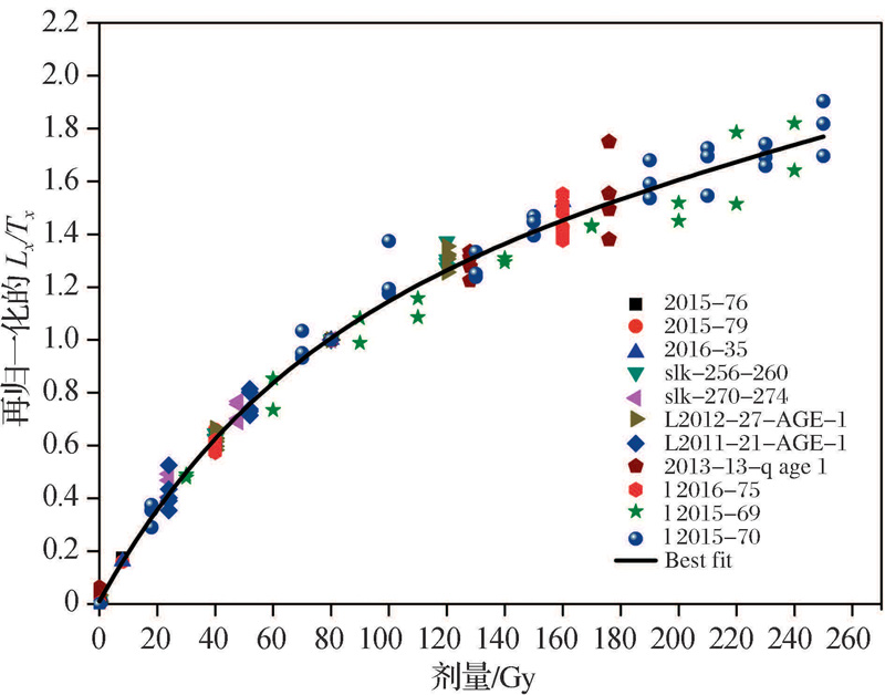 Roberts等[6]第一次在SAR法基础上提出了标准曲线(Standardised Growth Curve, SGC)法, SGC法的原理是认为所有石英样品应该有共同的剂量响应增长曲线, 因此只要建立一条标准曲线, 理论上就不需要针对每个样片再测量增长曲线。SGC法可以节约大量仪器测试时间, 为实验室测量大量样品提供了可能。但是SGC法在应用中发现其存在一定的局限性, 主要表现在较大剂量时, 不同样品甚至不同样片拟合出来的增长曲线离散度较大, 根据多样品或者多样片拟合出的一条增长曲线在采用SGC法求De时会存在较大的误差[7]。