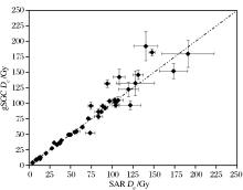 gSGC法通过对所有样品进行归一化, 从而建立了本实验室的一条gSGC增长曲线。gSGC法只需测出样品的自然剂量信号Ln和对应的实验剂量信号Tn以及一个再生剂量信号Lri和对应的实验剂量信号Tri就可以得出此样品的等效剂量De值, 极大缩短了测样时间。关于De的获取, 可以用公式(10)求得, 我们将本研究中的11个样品共39个测片应用公式(10)分别计算出各自的De, 然后与其对应的SAR De进行比较, 发现其gSGC De都比较接近SAR De, 如图4中发现散点大都围绕在y=x附近。从图4中还可发现, 在低剂量范围内, 即0~100 Gy内除点(73.52, 52.24)和(74.27, 96.08)差别较大外, 其他测片使用gSGC法估计的De和SAR法估计的De非常接近。由图4可知, 在较高剂量范围, 如大于100 Gy时gSGC法估计的De与SAR法估计的De会出现较大差别, 初步分析发现这是由于本研究用于拟合gSGC的样品数量不够多, gSGC增长曲线参数在高剂量区不够精确, 导致高剂量区的gSGC增长曲线出现较大误差。