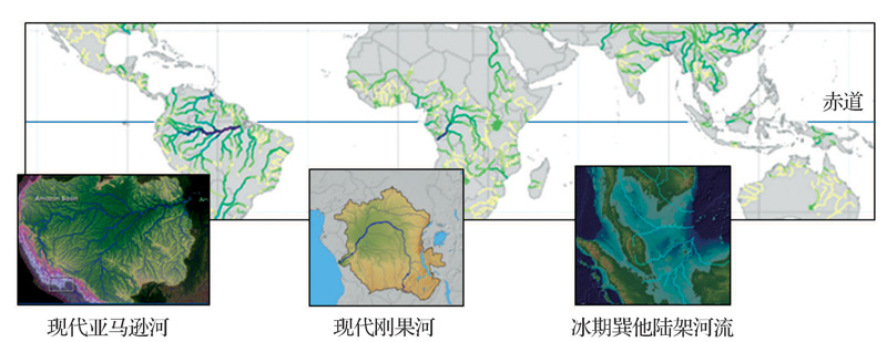 热带河流在地球表层系统中有着特殊的重要性。热带是雨量集中的地区,水循环最为活跃,容易形成大河、发育雨林,因而在地球表层水循环和碳循环中起着骨干作用[3 ] 。当今地球上美洲、欧非、亚澳三对大陆横跨南北半球,其中南美和非洲大陆跨越赤道,只有亚洲南端印尼等国的岛屿区,被冰后期海侵淹没为一片汪洋,称为“海洋大陆”[4 ] 。在赤道非洲,刚果河的入海流量世界第二、仅次于亚马逊河,总长4 700 km居世界第九位,流域面积占非洲的13% (图2 )。刚果河的源头在东非裂谷的高原区,是世界上最深的河(深达230 m),最终在几内亚湾注入大西洋。由于河道呈弧形流经赤道2次,受南北两半球影响,总有一部分流域处于雨季,因此常年流量稳定,使得刚果盆地拥有全球水力发电潜力的13%。和亚马逊河盆地相似,这里是当今世界第二大热带雨林区,占全球森林储碳的8%,是亚马逊之后地球上第二个“肺”。