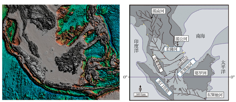 ... 以地质眼光看图2 ,不难发现世界上第二大的热带森林,本来该在东南亚而不是非洲,主体应该是今天的巽他陆架,只不过是被冰消期的海侵淹成泽国,才沦为“海洋大陆”.巽他陆架面积1.85×106 km2 , 平均水深70 m, 而在海底有深达40 m的下切河谷,是冰期低海面时河系发育的遗迹,因此在百年之前荷兰科学家就提出有古巽他河(Sunda River, 亦称Molengraaff River)的存在[5 ] .巽他陆架冰期时发育大河是在情理之中,因为其周围岛屿的山地河流,现在就是入海径流与沉积物的重要来源.所谓的“东印度群岛”,即巽他陆架周围的苏门答腊、爪哇、婆罗洲诸岛加上苏拉威西、帝汶和新几内亚,总面积只占世界陆地的2%,却为世界海洋提供了20%~25%的沉积物[6 ] .冰期时巽他陆架出露成陆,发育2支河系: 向东流入班达海的东巽他河和向北注入南海的北巽他河.1997年德国“太阳号”科考船,沿着北巽他河的入海河段执行其115航次,曾经取得海平面升降和沉积环境演变的重要证据[7 ] .巽他陆架注入南海的还有古湄南河、湄公河与巴南河(Baram River,未标出)等(图3 ),其中特别值得注意的是古湄南河和湄公河这2条世界级的大河.尤其是古湄南河(Palaeo-Chao Phraya River),近来发现当时应与暹罗湾的柔佛河(Johore River)相连,从泰国北部山地沿着暹罗湾向东南流,全长1 200 km,可称为古湄南—柔佛河(palaeo-Chao Phraya-Johore River).其集水盆地广达1.35×106 km2 ,在南亚论规模仅次于雅鲁藏布江,推测其流量可以和长江相比[8 ] .如果推断正确,这将是冰期时东南亚赤道地区最大的河流,和湄公河、巽他河等大河在一起奔流在巽他陆架上,使之成为与亚马逊河盆地、刚果盆地同样的巨型热带雨林,为当时的地球提供第三个“肺”. ...