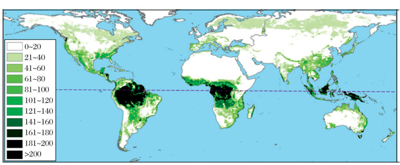 赤道地区的大河不仅是全球水循环中最活跃的一部分,也是碳循环演变的关键环节,因为世界上主要的热带雨林就分布在这些大河流域。陆地的碳库主要是植被与土壤,其中树林的作用最大。全球陆地面积30%是树林,而植物总生物量的92%属于森林、66%属于热带森林,热带森林就是陆地生物量最为密集、单位面积含生物碳最多的地方(图4 )[11 ] 。不过陆地碳储库除了植物之外还有土壤,树林里土壤储碳和活的生物储碳在数量上相近,但是活的植物含碳在低纬区多,而土壤里含碳量最高的却是北半球的高纬区。尽管如此,将生物量与土壤相加,全球树林55%含碳量在热带[12 ] ,无论怎么算热带树林总是陆地碳库的主角。