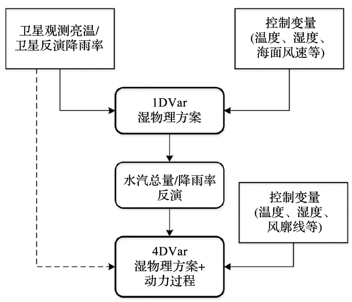 ... 在两步法中[27],首先通过1DVar方法同化卫星观测亮温或降雨率产品,相对于同化降雨率,同化亮温由于观测—背景偏差更符合高斯分布成为主要发展的技术.调整控制变量如温度廓线、绝对湿度廓线(或湿度的对数)和海面风速,通过最小化代价函数寻找最优化的大气状态,代价函数表征如下: ...