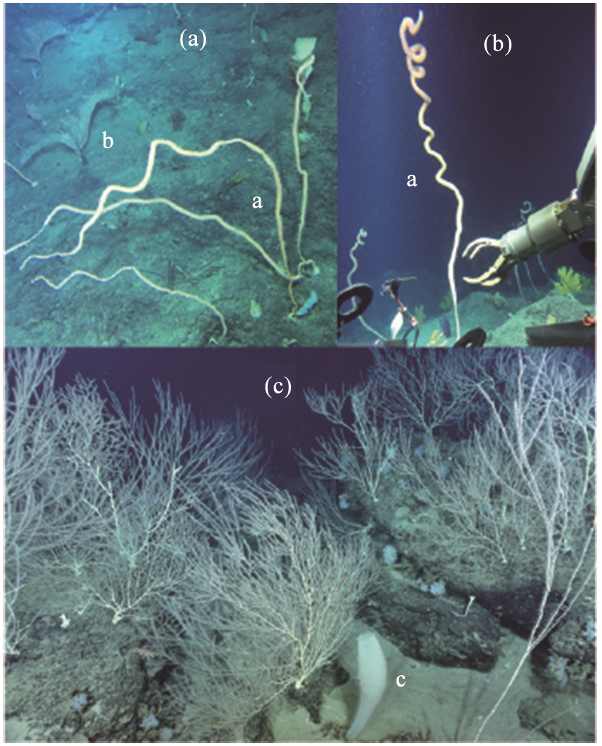 | 图1 南海的深水珊瑚林 (a),(b) 西沙深海的珊瑚林 (2018年“深海勇士号”拍摄); (c) 深海盆海山上的珊瑚林(2018年“ROPOS”拍摄,周怀阳 提供); a为竹节珊瑚Lepidisis sp.; b为扇珊瑚Calyptrophora sp.; c为玻璃海绵 |