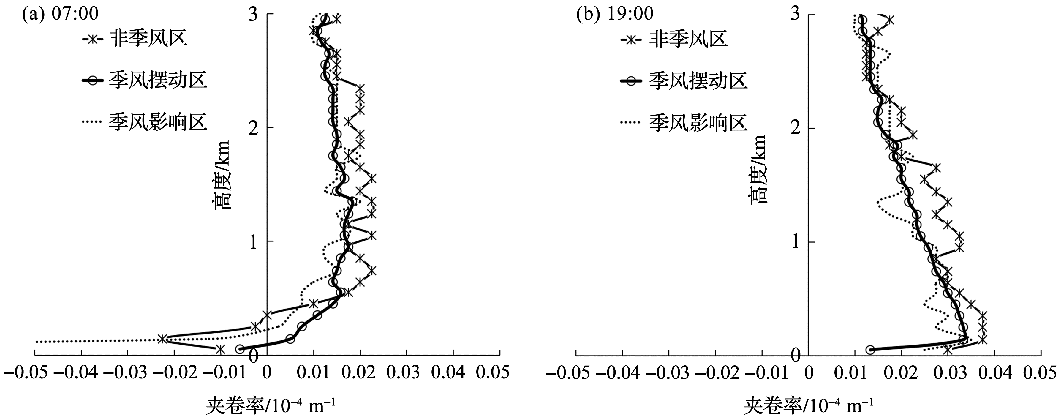 | 图4 不同季风区季风期夹卷率随高度的分布 |