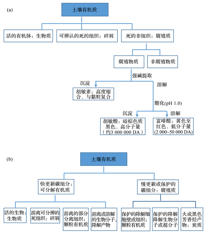 ... 21世纪以来,腐殖质组分抗微生物分解的内在(化学)稳定性经典学说越来越被诟病.Kleber[43] 强烈质疑腐殖质学说,认为腐殖质组分抗分解概念是模糊和抽象的,严重误导了土壤碳循环与气候变化的反馈研究,某些组分的固有抗分解性不是其分子性质所决定的,而是受到微生境条件下的生物可达性及/酶反应动力学的制约.例如北美草原土壤农耕后残留的土壤有机碳,更多地稳定于黏粒和细粉砂组分的复合体中,有机碳的14C绝对年龄可能在百年水平[54],他们不是因为腐殖化形成的老碳而残留,而是因为与细颗粒结合,免于分解而保持[55].气候变化研究中经常报道有机质分解的温度敏感性,也支持了是分解条件而不是分解基质的性质决定有机质抗分解性的观点.例如,Fang等[56]实验报道老碳和新碳对升温下微生物分解同样敏感.后来的研究[57]进一步证实14C同位素指示的森林土壤中新碳也可能比老碳中的有机质芳构化更强,而烷基化分子相对更少.Dungait等[58]讨论了现行碳模型的有机质动力学模拟问题,指出已有研究资料并不能支持有机质可分解性可以预测有机质的变化,而复杂分子结构的腐殖质抗微生物分解的化学稳定说不能解释有机质的稳定性.分子检测技术的进步使我们认识到许多土壤中含有大量可分解的有机质.我们不得不认为,探寻化学稳定碳来诠释固碳,可能使土壤固碳机制的探索走向歧途[58].而认识土壤碳不被微生物利用的保护机制既能更好地模拟碳动态,又能用于土壤管理.由此看来,腐殖质学说的化学结构稳定性不但在化学本质上受到质疑,在解释土壤有机质稳定机制上也日益显得苍白而难以为继.基于有机质物理化学本质的腐殖质学说可能误导了对土壤有机质过程以及生态系统碳循环的理解,需要新的角度和技术方法重新构建土壤有机质理论[59,60,61].这些认识进展已经反映在国外权威教科书《The Nature and Properties of Soils》第15版对其第14版中关于土壤有机质概念及其组成结构的修正上(图1)[62,63]. ...