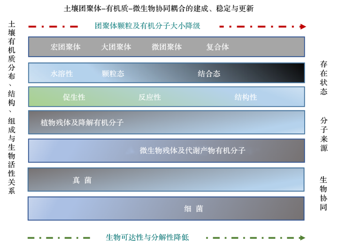 ... 从本源上说,土壤物质就是大小、结构和功能(反应性和生物活性)不同的、矿物质—有机质—微生物有序集合的土壤团聚体颗粒集合.其形成、发育和稳定属于土壤的生物动力学过程(biodynamics)[158],是土壤形成及相关生命过程的基础.植物等生物活动剩余物输入的有机物质,一方面作为原始材料驱动土壤有机质形成和稳定;另一方面,它们被土壤中的食物网,特别是微生物分解利用,并提供其活动的能源.而土壤团聚体的形成、稳定和更新提供和维持了有机质—微生物—生物功能的偶联关系及其稳定,是土壤发挥生物地球化学作用和生物多样性保持[6]的根本.因此,土壤有机质连续体实际上是一种保持有机质—微生物—生物活性良好协同的微域机制框架. ...
