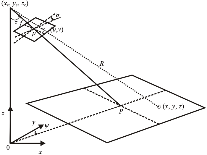 式中:系数L1~L11是7个未知量(τ, φ, σ),(xc, yc,zc)和f的线性函数。这7个未知量可以通过已知图像和现实世界坐标获取的一系列参考点[也称为地面控制点(Ground Control Points,GCP)]来确定。为此需要在硬件系统安装好后,测量海滩周边明显轮廓点以及滩面上一些点的地理坐标和高程。通过图像校正与坐标转换,将处理后所有摄像头的图像以一定的角度融合,就可以获得海滩的全景图与平面图。