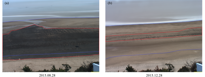 蓝色线为当天最高与最低潮位线,红色线所围区域为砾石分布区
