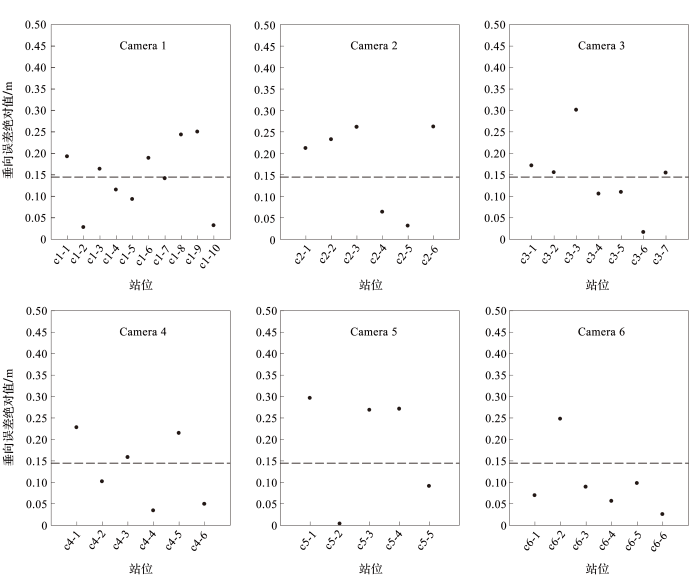 利用Argus视频图像监测系统中的iBathy模块可以获得整个滩面的地形数据,其所采用的插值方法为线性插值。为了验证所获数据的误差,我们使用RTK GPS于2016年5月4日对东沙海滩进行了一次现场勘测,在潮间带内测量41个控制点以验证视频测量数据的精度(高程均为国家85高程),C1~C6摄像头覆盖范围内控制点数分别为11,6,7,6,5和6个(图8)。