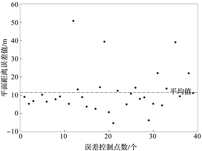 将RTK GPS滩面地形勘测点及Argus地形插值结果中对应点的高程进行比较,发现垂向平均相对误差为15%且误差全部分布在0.3 m以下(图9),6个摄像头(C1~C6)误差平均值为0.145 m,小于视频监测系统设计时的误差最大值0.25 m,这与很多已有研究的误差值相当[4,9,10,11,12,13]。通过比较2个控制点之间的实测距离与Argus数据算得的2点距离可以测算平面距离误差(图10),得出平面距离误差平均值为11.73 m(剔除异常值),误差值主要集中在0~10 m,误差众数在允许范围(0.5~20 m)内[6]。误差分布呈现出以下规律:离Argus观测站距离越近,垂向和平面误差越小;误差控制点之间的间距越大,平面距离误差越大。
