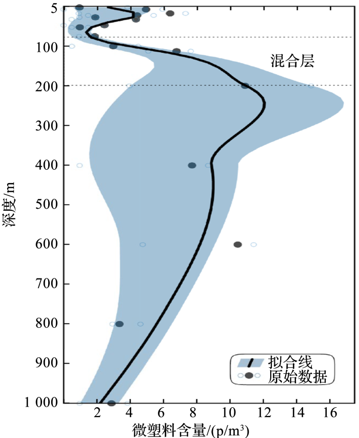 ... 海洋微塑料在全水柱中都有分布,并呈现不均一性.据少量浮游生物分层拖网在北大西洋亚热带环流区的航次调查,发现微塑料碎屑广泛分布在水柱顶部0~5 m范围内,其含量随深度呈指数衰减,到5 m深度几乎为0[37 ,38 ,39 ] .美国加州岸外蒙特利湾调查结果显示(图2 ),水柱中微塑料含量峰值为15 p/m3 ,出现在200 m深度的混合层底边界,而低值(2.9 p/m3 )出现在顶部5 m深度和底部1 000 m深度[40 ] .北冰洋中央海盆调查结果也同样发现微塑料含量峰值(0~375 p/m3 )出现在上部混合层水体中[41 ] ,说明海洋微塑料在水柱中的垂直分布受到海水分层的影响. ...