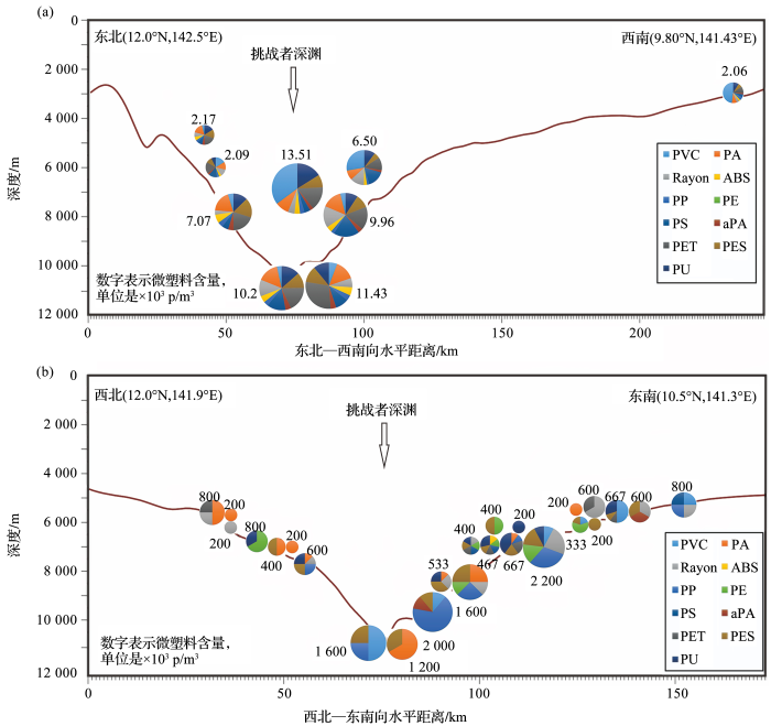图4 马里亚纳海沟深层海水(a )和海底表层沉积物(b )中微塑料分布及组成[11 ] Profile of microplastic abundances and compositions in hadal water (a) and sediments (b) from Mariana Trench[11 ] Fig.4 ![]()