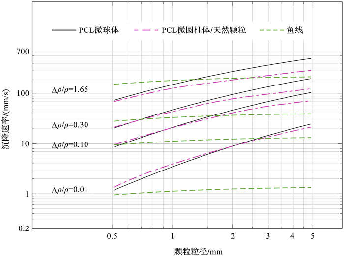 Predicted settling velocities of microplastic particles of different physical characteristics [45 ] Short isometric cylinders (red dash-dot curves) were circular rods with diameters equal to the length, approximating the natural grains; Δρ/ρ represent the relative excess densities of particles to seawater ...