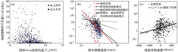 (a)海洋表层塑料碎屑含量数据来自708个航次调查结果,碎屑含量超过4×105 p/km2 的24个数据点没有显示;(b)航次调查结果(红线)和基于波平均纳维—斯托克斯方程的大尺度涡模拟结果(黑线),模型采用恒定的上浮速度1.4 cm/s;(c)航次调查全部结果(灰点)和海面10 m高度风速5~7 m/s情况下的结果(黑色加号) ...