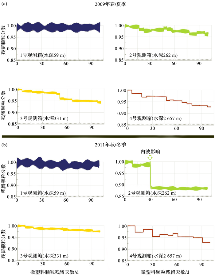 ... 沉积在海底的微塑料颗粒能够随再悬浮沉积物向深海侧向运移.海底峡谷是所有陆源碎屑物质由浅海向深海运输的重要通道,其沉积物中塑料碎屑含量也要高于邻近陆架沉积物[70 ,71 ] .基于葡萄牙岸外纳扎雷海底峡谷(Nazaré Canyon)的地形和水动力环境,Ballent等[46 ,47 ] 利用MOHID水体模型模拟高密度微塑料颗粒在海底峡谷的迁移过程.如图8 所示,模型观测箱中微塑料残留颗粒分数呈现十分规律的正弦波振荡,具有全日和半日周期,说明潮汐是控制峡谷底层微塑料搬运的主要因素.模拟结果显示,海底峡谷地形、水动力环境限制了微塑料颗粒在峡谷顶部的搬运过程:微塑料颗粒在潮汐力作用下沿峡谷轴向往复搬运,秋冬季潮汐作用的搬运能力有所增强,但沿峡谷向下的净位移量仍不明显,微塑料从峡谷顶部迁移到深海盆估计需要百年甚至更长时间[47 ] .但是,海底峡谷中突发的内波会引起微塑料颗粒搬运过程中的剧烈扰动(图8 b),强烈增加微塑料搬运速度、缩短搬运时间[47 ] .台风和风暴等极端天气还可能诱发河口—海底峡谷环境中的深海浊流[72 ] ,也会携带海底微塑料在内的沉积物从近岸搬运到深海盆,但深海浊流对微塑料的搬运过程还未有报道,有待深海原位观测结果的验证. ...