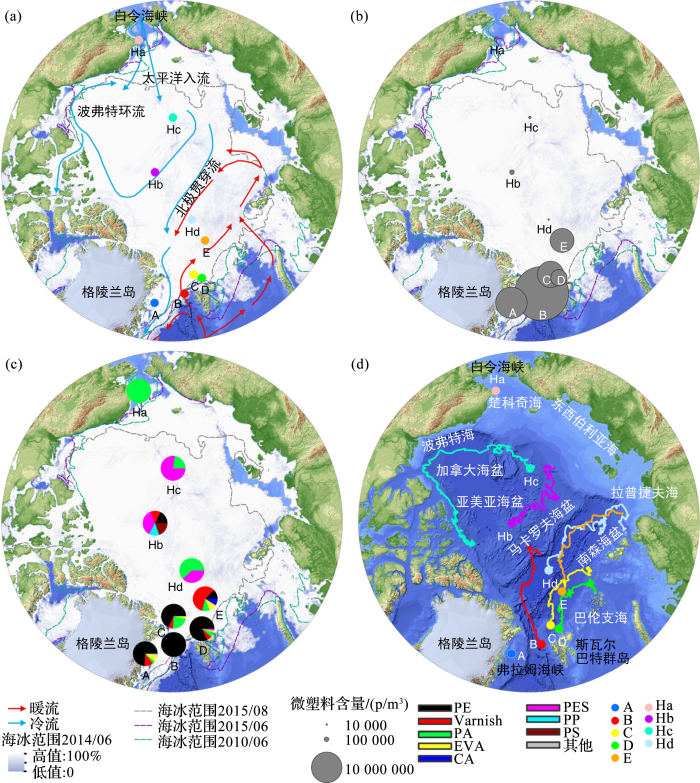 ... (a)冰芯(A~E和Ha~Hd)位置和北冰洋表层洋流系统;(b)微塑料总数量分布;(c)微塑料组份含量分布;(d)除A和Ha外的海冰冰芯漂移轨迹