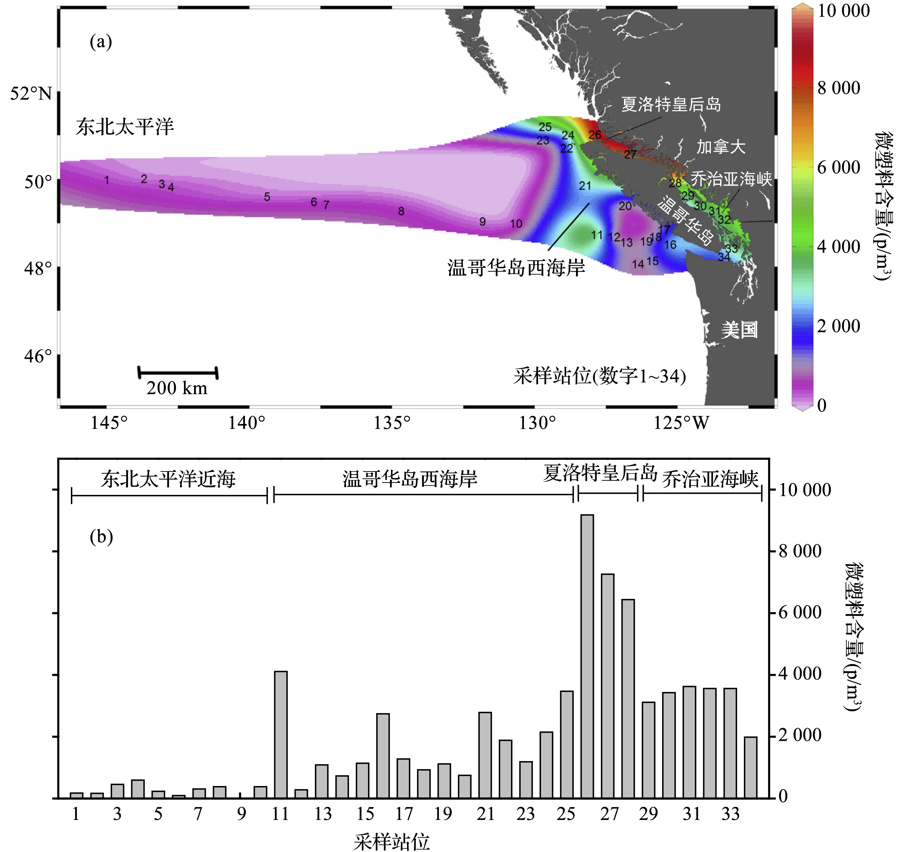 | 图3 东北太平洋近海表(水深4.5 m)微塑料含量分布[ |