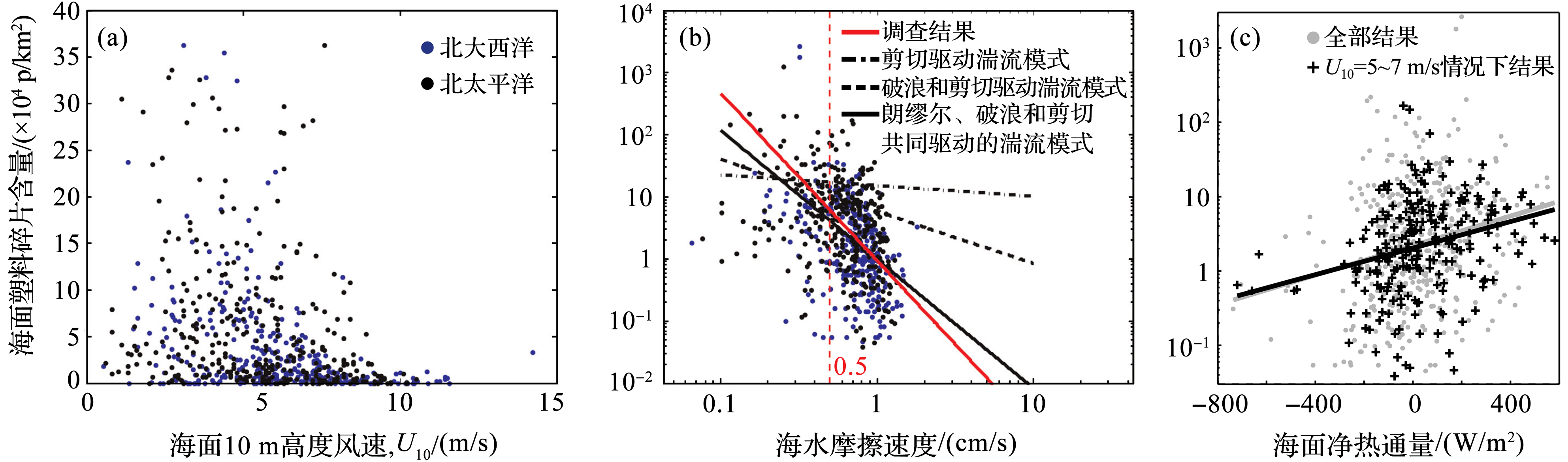| Fig.6 Sea surface (<0.25 m)plastic concentrations influenced by ocean dynamic state[ (a) Surface plastic concentrations derived from a total of 708 observations, the 24 largest plastic concentration values greater than 4×105 p/km2 are not shown; (b) Regression lines for the observations (red line) and for the large eddy simulations (black lines) of the wave-averaged Navier-Stokes equation, given a terminal buoyant rise velocity as 1.4 cm/s; (c) Surface plastic concentrations of all observations (gray dots) and subsampled observations (black pluses) for 5<U10<7 m/s |