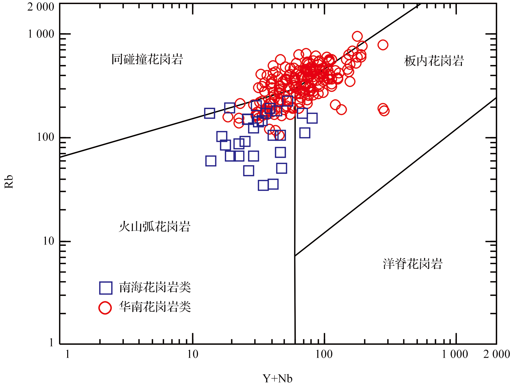 | 图2 南海及华南东部晚中生代花岗岩类 (Y+Nb)-Rb构造环境对比(数据引自文献[35,43,44~52]) |