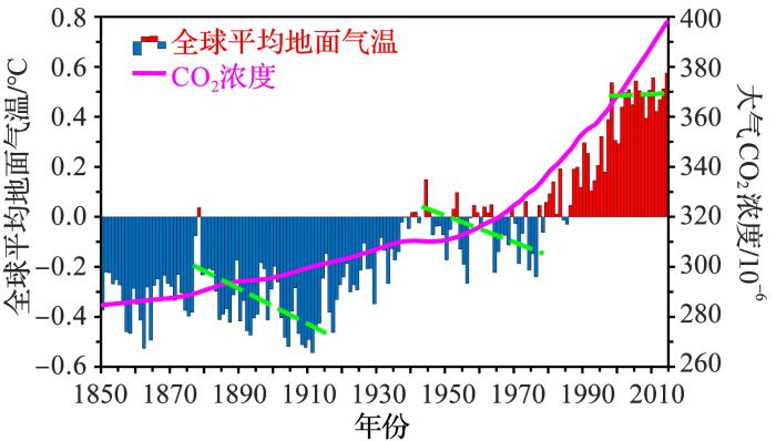The global mean temperature and global atmospheric CO2 concentration from 1850 to 2014 [2 ] 绿色虚线分别表示3个气温停滞阶段(1877—1913年,1944—1976年以及1998—2014年的线性趋势) ...