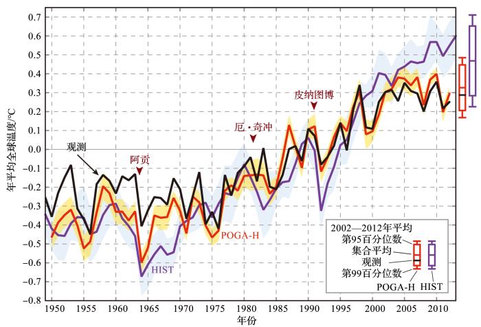 ... 自工业革命以来,全球温室气体浓度持续加速升高,气候系统能量收支不平衡,全球变暖不断加剧.全球变暖与人类生活、社会发展息息相关,一直受到世界各国的高度关注,其伴随的海平面升高、极地海冰消退、海洋增温以及极端天气气候事件爆发频率增加等问题在气候变化研究中更是极为重要.自19世纪以来,全球平均地面气温大约增加了1 ℃ ,20世纪全球平均地面气温大约增加0.75 ℃ ,20世纪后半叶,温室气体造成平均每10年增温约0.13 ℃ [1 ] .20世纪以来全球温度的整体变化特征呈现出同温室气体增加类似的增长趋势,然而20世纪90年代末至21世纪初,全球平均地面气温增温速率趋于0(甚至为负)(图1 [2 ] ),与CO2 浓度持续增长不一致,全球CO2 不能解释这一时期的温度变化特征.过去100年还曾发生过2次类似增温停滞现象,降温的时间尺度约为30年.Smith等[3 ] 最先报导自1998年之后全球地面气温的增温趋势不明显,之后很多媒体和资料分析指出自1998年后全球气温不再升温,甚至出现“变冷”[4 ] .Easterling等[5 ] 通过一系列20世纪和21世纪未来情景预测的模拟试验及观测对比分析,指出21世纪初的10~20年全球平均地面气温表现为无趋势甚至稍微变冷的趋势.Knight等[6 ] 的分析指出,自20世纪90年代末以来全球增温趋势为每10年增温(+0.07±0.07) ℃ ,远小于1979—2005年的每10年升温0.18 ℃ 的趋势.Kerr[7 ] 在Science 上报道了这些研究,之后上述现象被称为全球变暖停滞(又称全球变暖趋缓/减缓/减速、全球变暖暂停等,global warming hiatus/slow down/pause).Medhaug等[8 ] 2017年指出,全球变暖停滞主要指1998—2012年全球平均地面气温呈现较弱的增温或者变冷的趋势.联合国政府间气候变化专门委员会(Intergovernmental Panel on Climate Change,IPCC)第五次评估报告(Fifth Assessment Report,AR5)[1 ] 中指出,1998—2012年全球变暖速率为每10年0.05 ℃ (-0.05~0.15 ℃ ),而在1951—2012年,全球变暖速率则为每10年0.12 ℃ (0.08~0.14 ℃ )[9 ] ,全球变暖停滞现象是确实存在的气候变化事实.前人研究表明,从1910年开始,全球增温速率分为4个阶段,分别是1910—1940年和1976—1998年的全球加速增温阶段,以及1940—1975年和1998—2012的全球变暖停滞阶段[2,8~12] ,全球地面气温呈现出明显的多年代际变化特征[10,13~15] . ...
