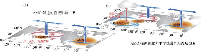 图4 大西洋多年代际振荡远程调控西太平洋年代际变化的物理机制图[72 ] Schematic diagram for the teleconnection between AMO and western tropical Pacific decadal variability [72 ] Fig. 4 ![]()