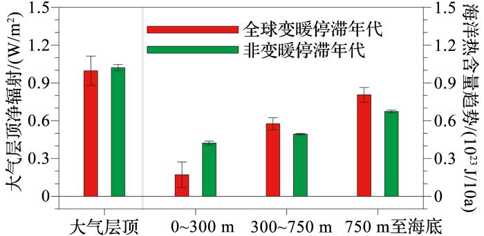 图左:全球变暖停滞时期(红色)与非停滞时期(绿色)大气层顶净辐射变化趋势(正值表示进入气候系统的净辐射);图右:0~300 m,300~750 m以及750 m至海底海洋热含量的年代际趋势 ...