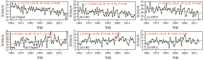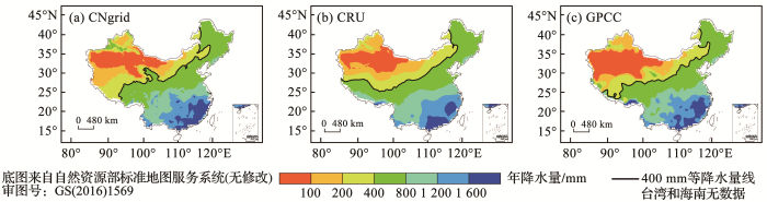 ... 使用基于中国2 472个气象台站观测资料的网格化降水(CNgrid)[21]、GPCC(the Global Precipitation Climatology Centre)[22]和CRU(the Climate Research Unit)[23]3套降水数据,我们分析了1961—2019年中国400 mm等降水量线分布特征.研究表明,中国大陆降水量均呈现出从东南向西北逐渐减小的分布规律.3套数据在东部气候区降水空间分布较为一致,而在西北地区存在一定差异,CNgrid融合了更多站点观测数据,更好地刻画降水分布的细节特征(图1),例如,它更清晰地反映出青藏高原北部柴达木盆地和祁连山地区的降水分布. ...