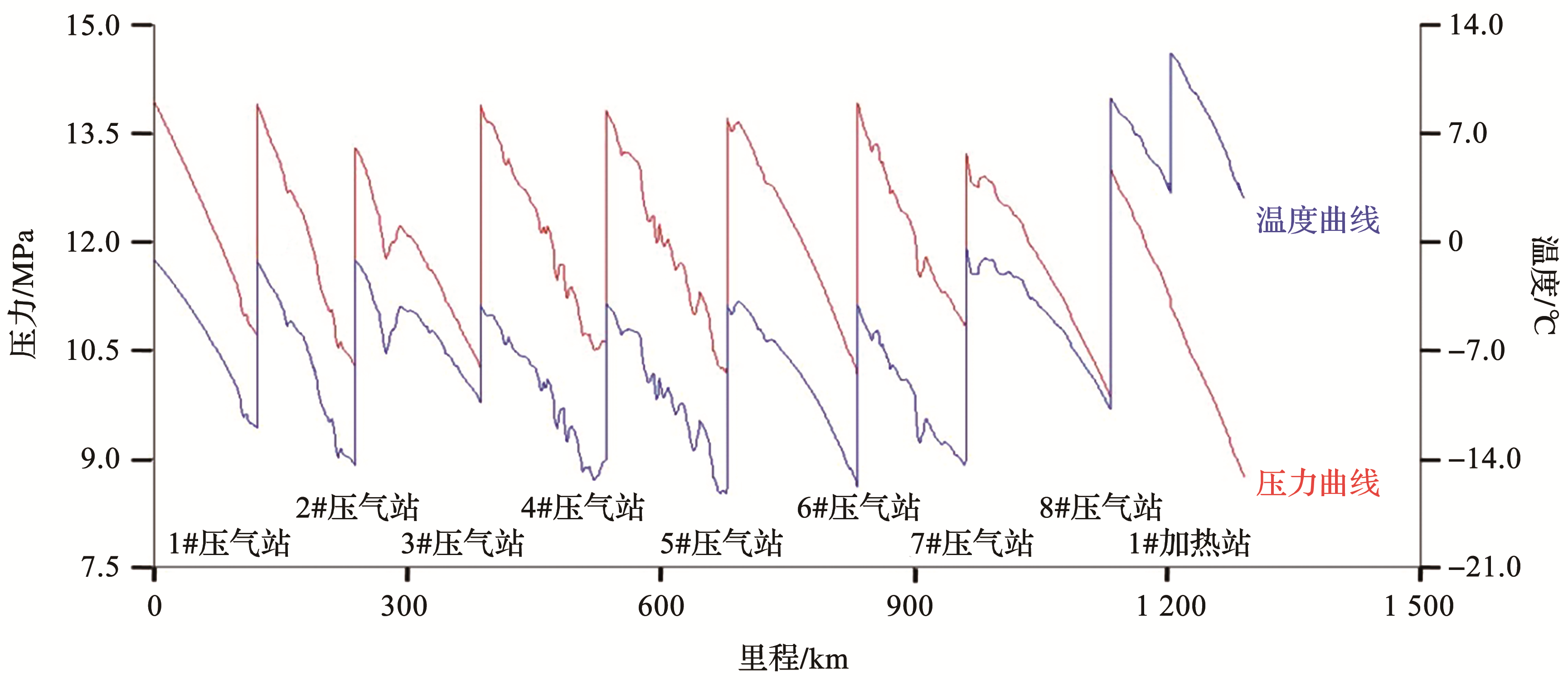 | 图5 某多年冻土区天然气管道沿线压力和温度曲线图(冬季工况) |