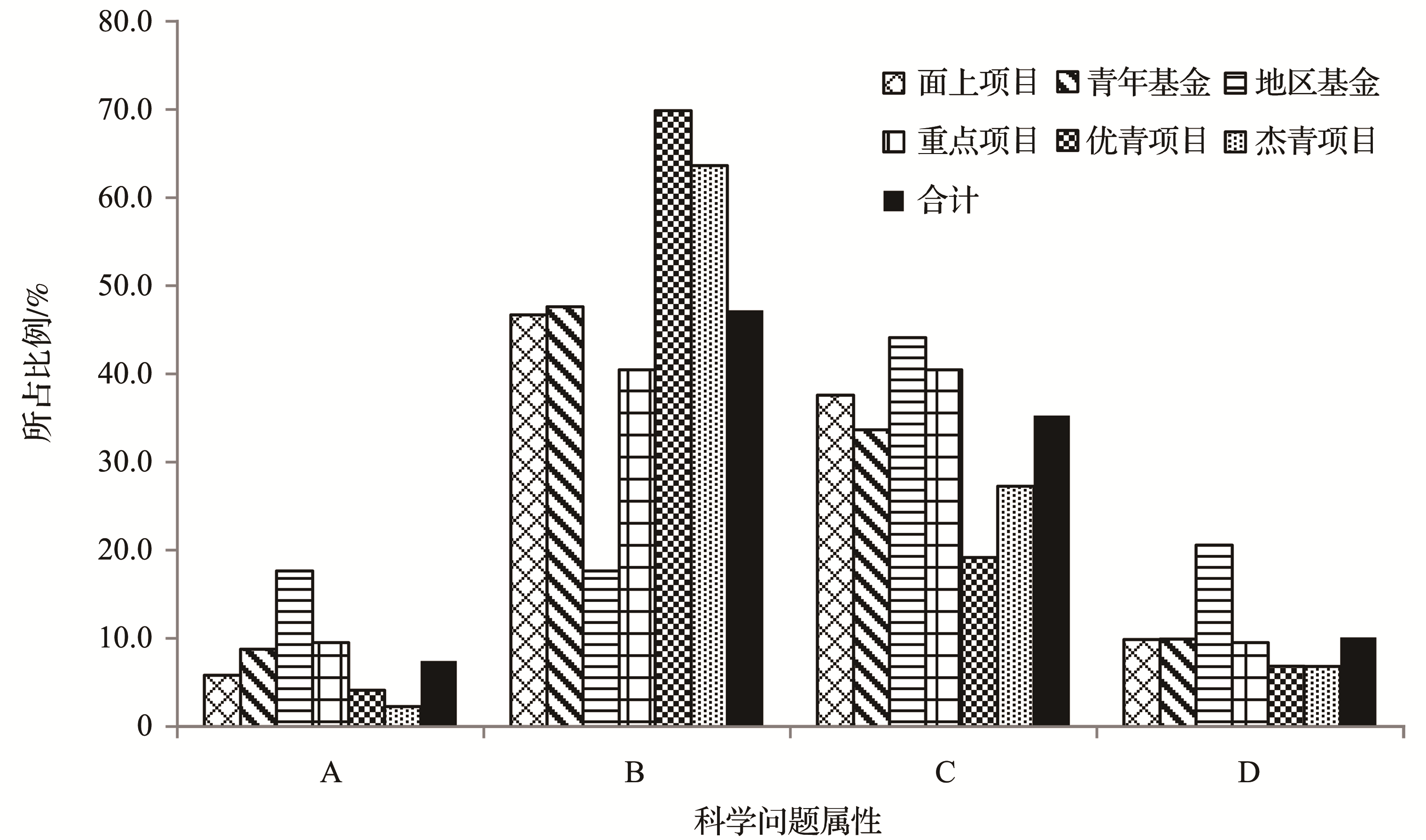 | 图2 2020年各类项目不同科学问题属性项目占比 |